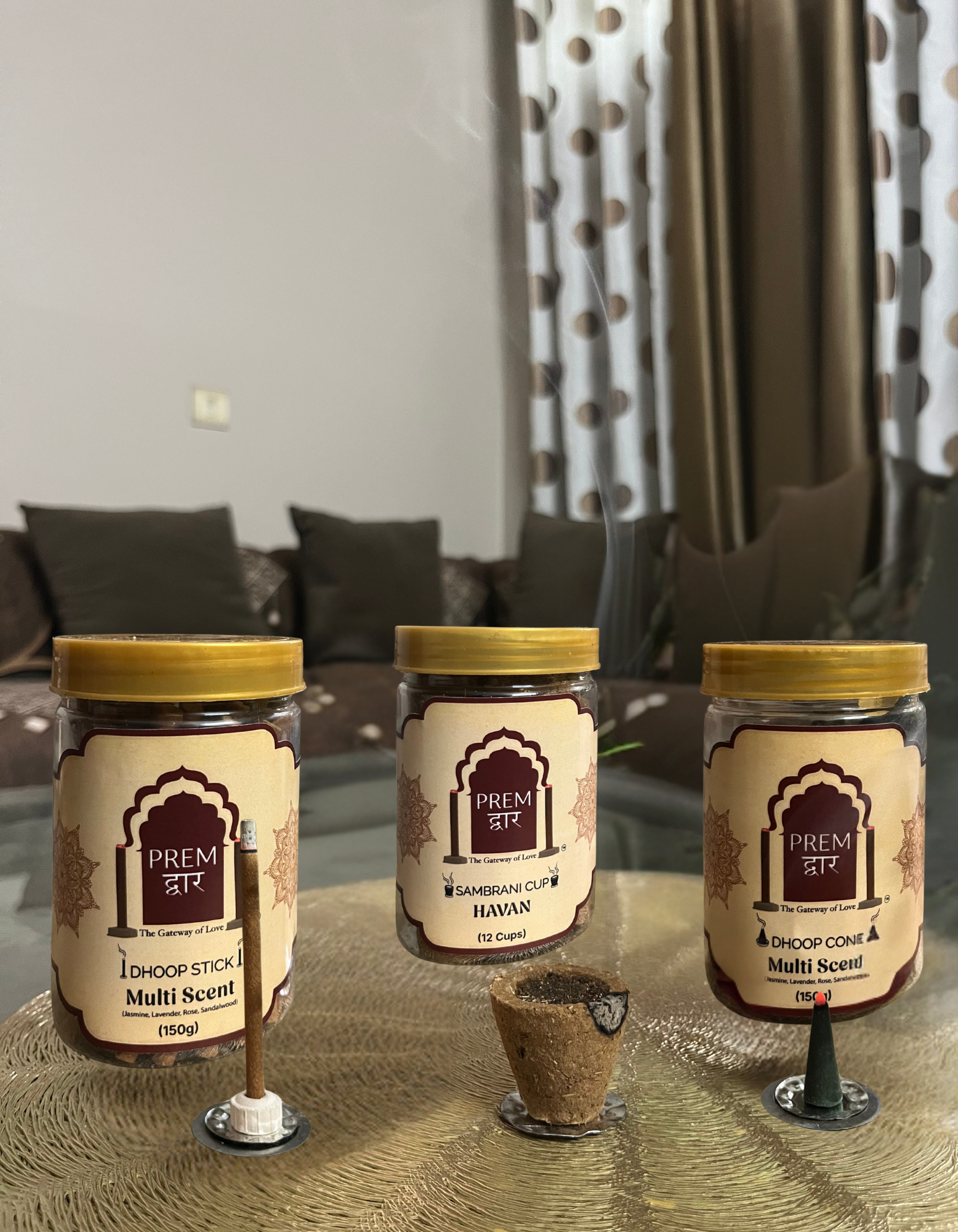 - A 150g Jar of Multi-Scent Dhoop Cones with all 4 Scents(Jasmine, Lavender, Rose, Sandalwood)